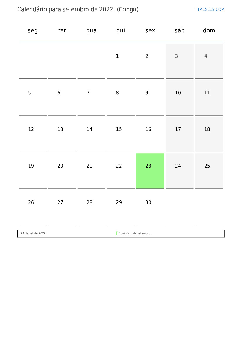 O mês de setembro contém 30 dias. Este é 9 mês de 2022. Estação do ano: outono. O mês de setembro começa na quinta feira e termina na sexta. No mês de setembro de 2022, há 1 feriado e dia de folga no congo.