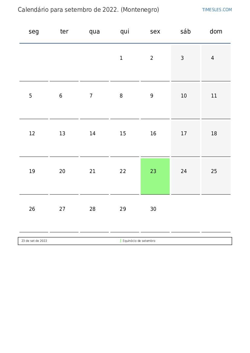 O mês de setembro contém 30 dias. Este é 9 mês de 2022. Estação do ano: outono. O mês de setembro começa na quinta feira e termina na sexta. No mês de setembro de 2022, há 1 feriado e dia de folga em Montenegro.