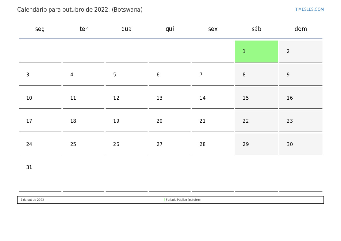 Calendário de feriados e fins de semana para outubro de 2022 para o Botswana