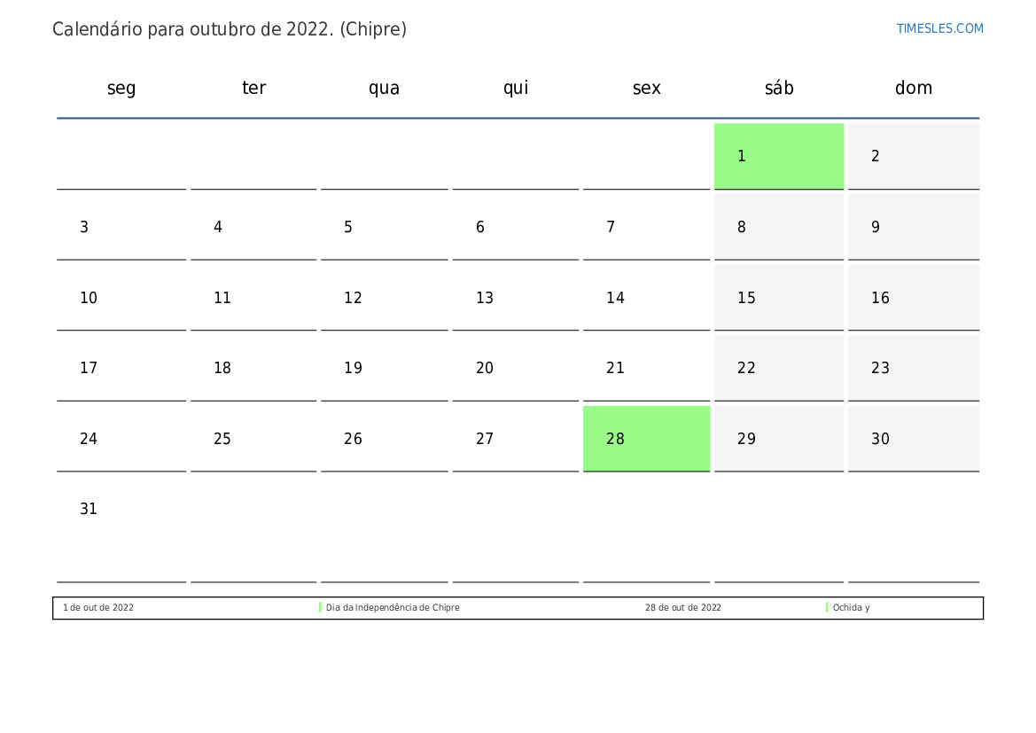Calendário de feriados e fins de semana para outubro de 2022 para Chipre