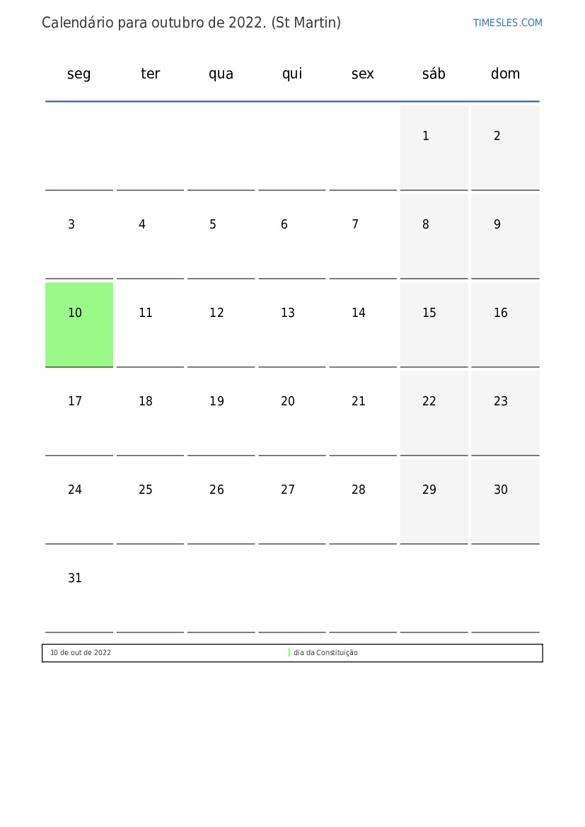Calendário de feriados e fins de semana para outubro de 2022 para Sint Maarten