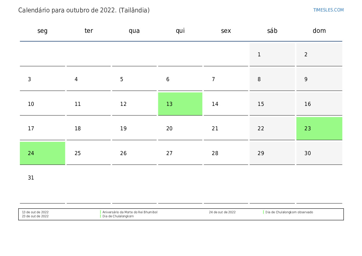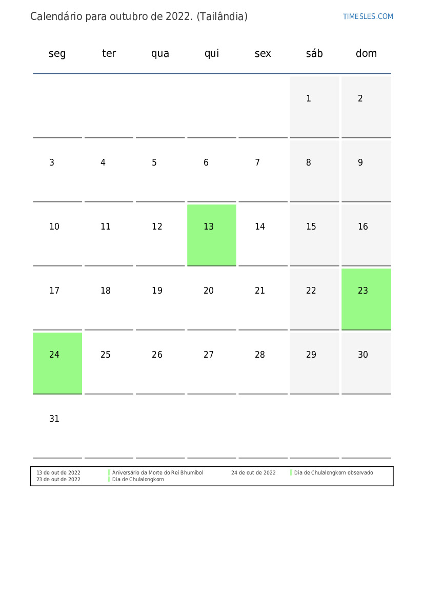 Calendário de outubro de 2022 para a Tailândia