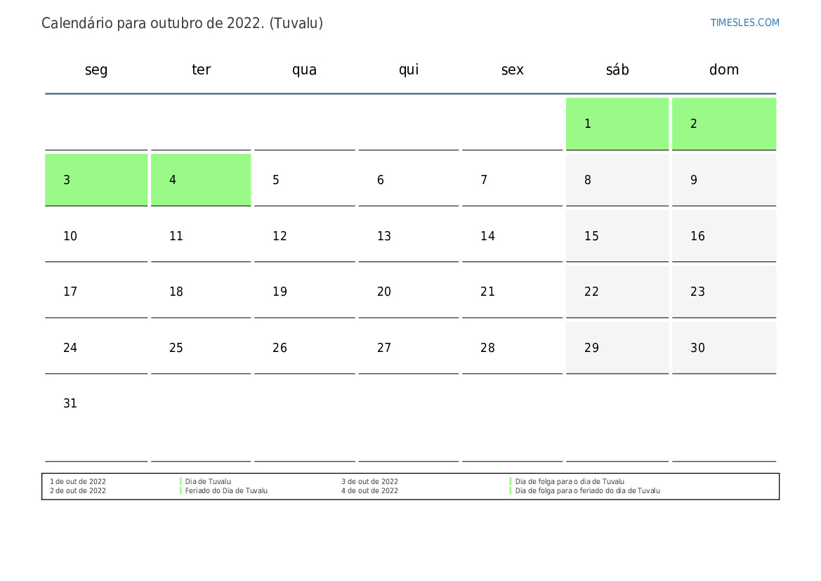Calendário de feriados e fins de semana para outubro de 2022 para Tuvalu