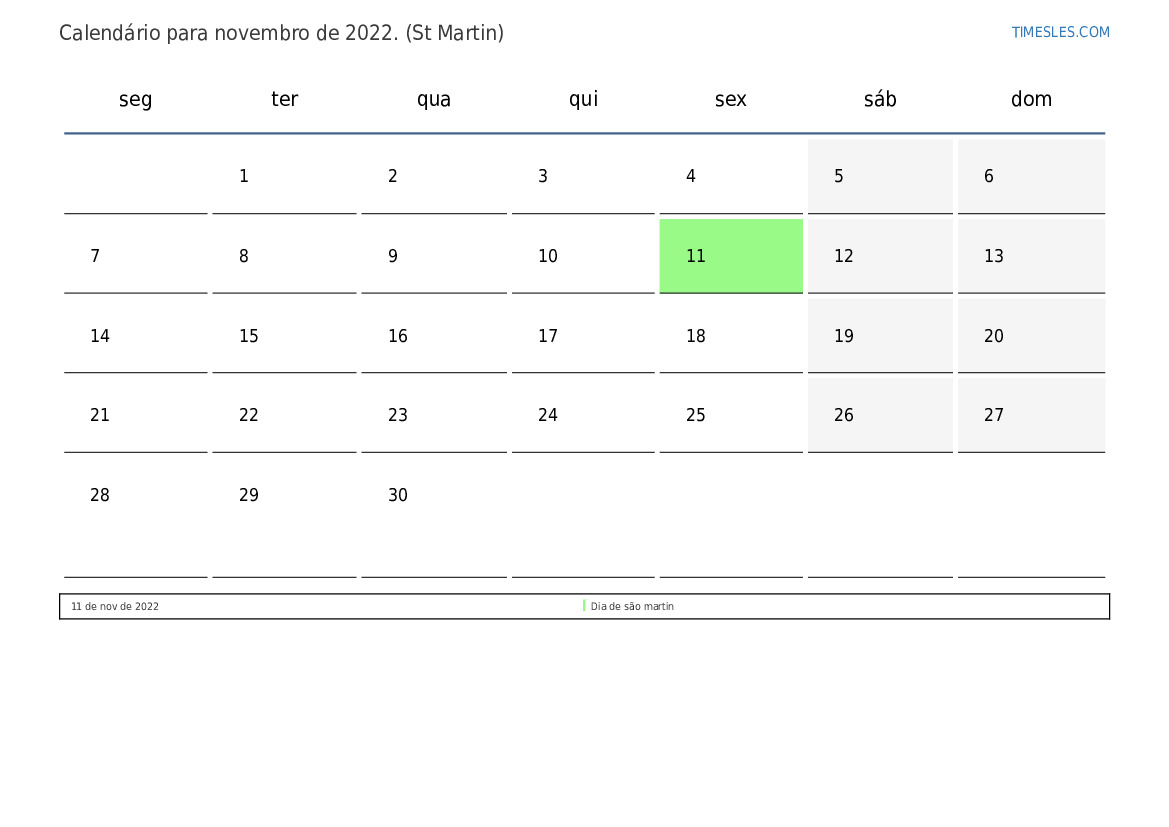 O mês de novembro contém 30 dias. Este é 11 mês de 2022. Estação do ano: outono. O mês de novembro começa na terça-feira e termina na quarta-feira. No mês de novembro de 2022, há 1 feriado e dia de folga em Sint Maarten.
