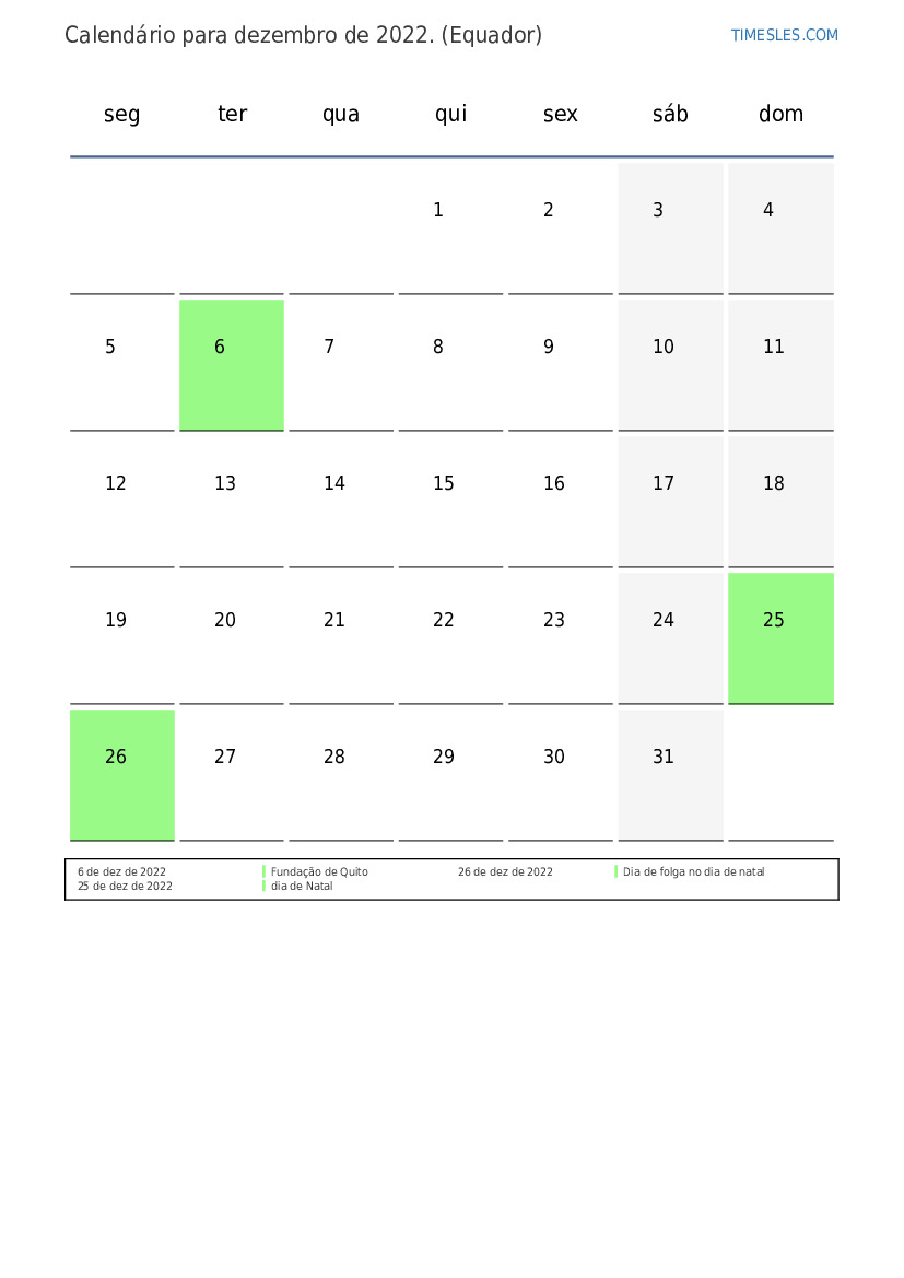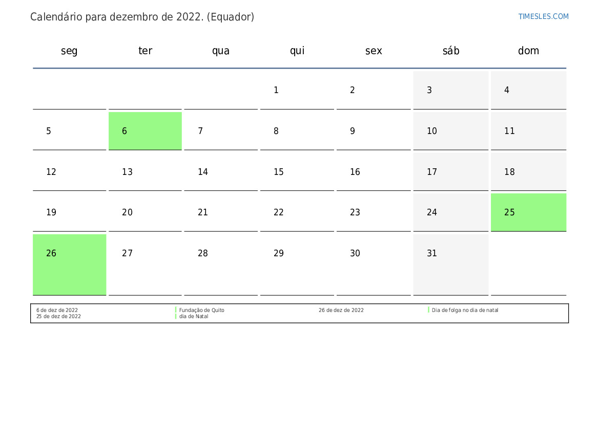 Calendário de feriados e fins de semana para dezembro de 2022 para o equador