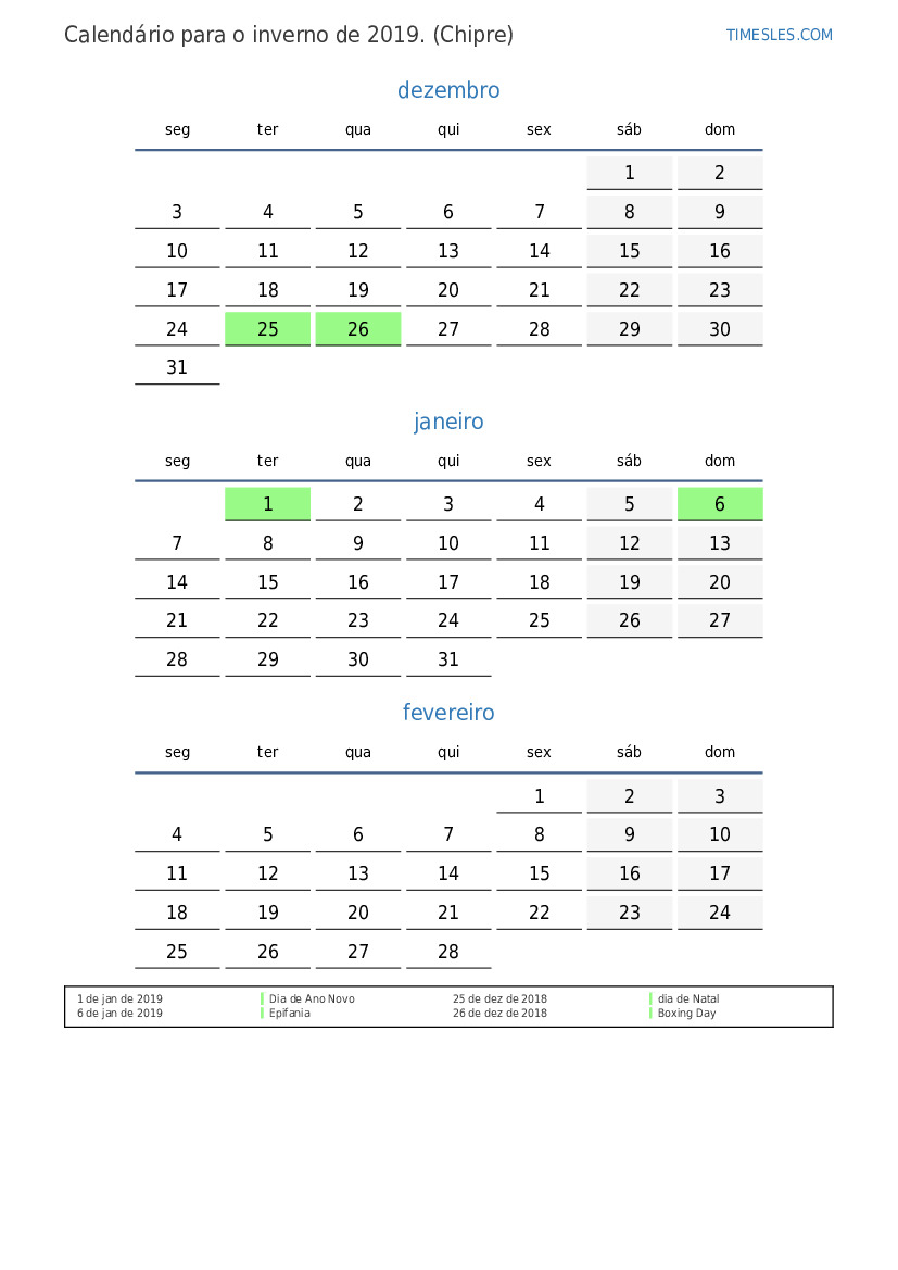 Calendário de feriados e fins de semana para o outono de 2019 para Chipre