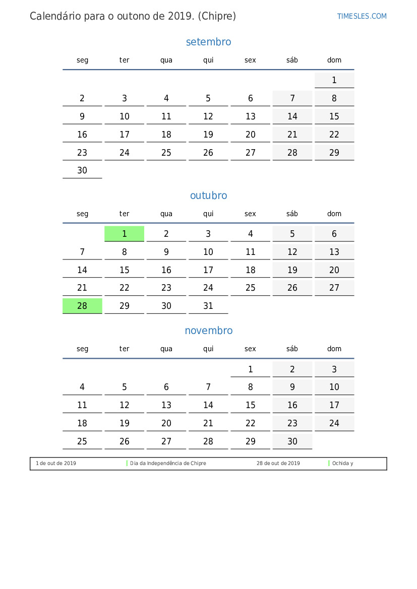Baixe e imprima calendário em PDF com feriados e fins de semana para o outono de 2019 para Chipre