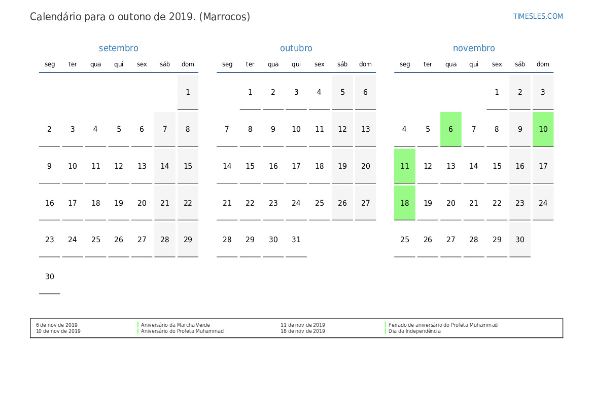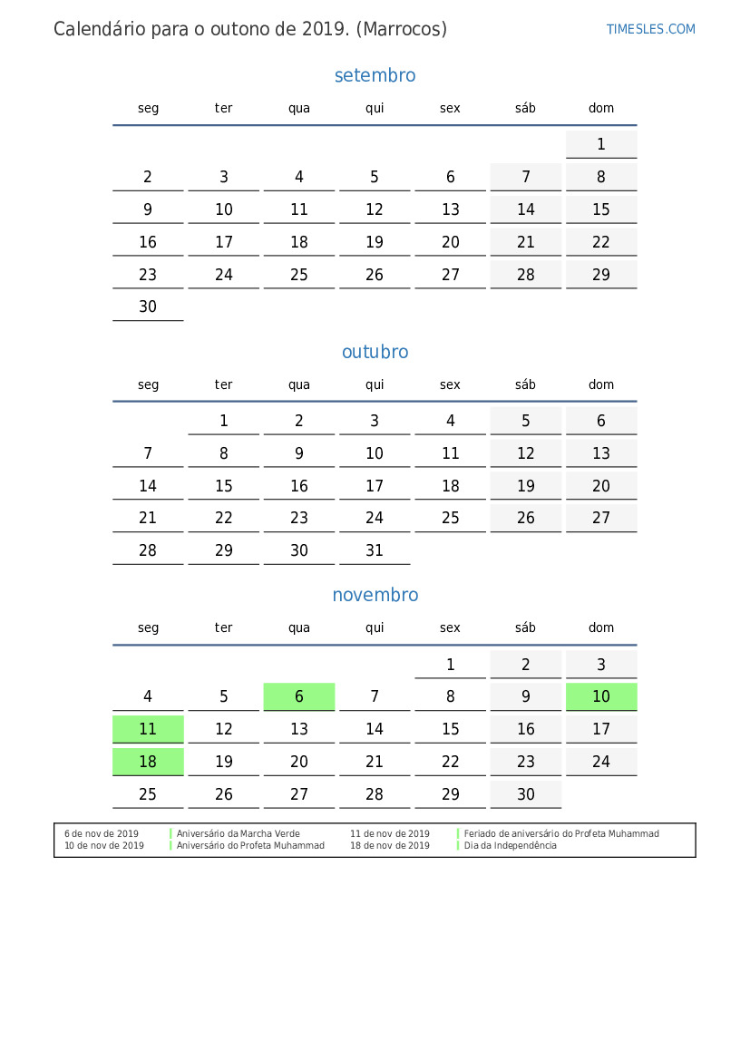 Baixe e imprima calendário em PDF com feriados e fins de semana para o outono de 2019 para o Marrocos