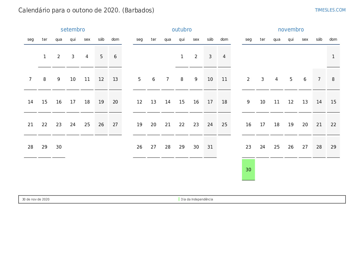 Baixe e imprima calendário em PDF com feriados e fins de semana para o outono de 2020 para Barbados