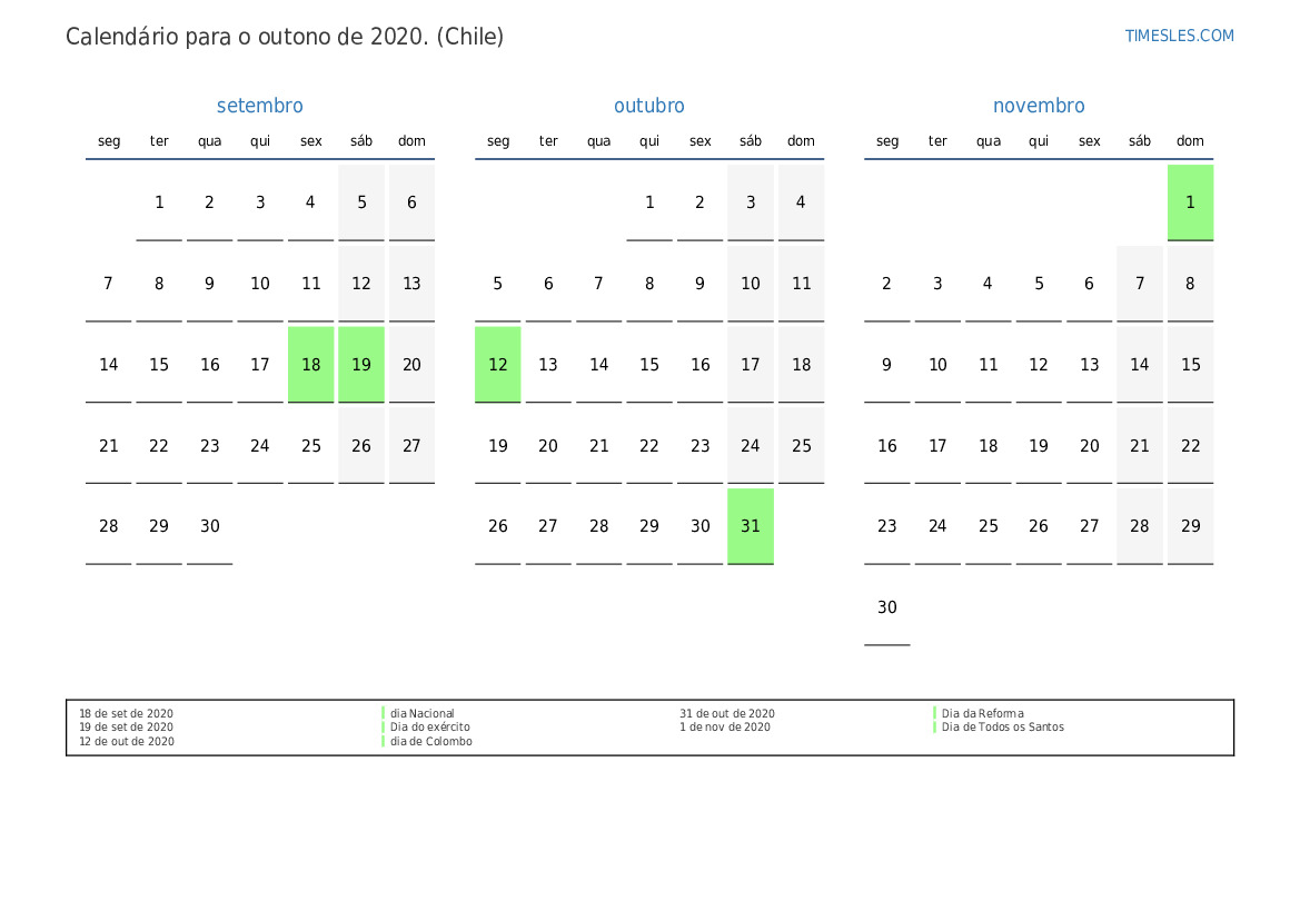 Calendário de feriados e fins de semana para o outono de 2020 para o Chile