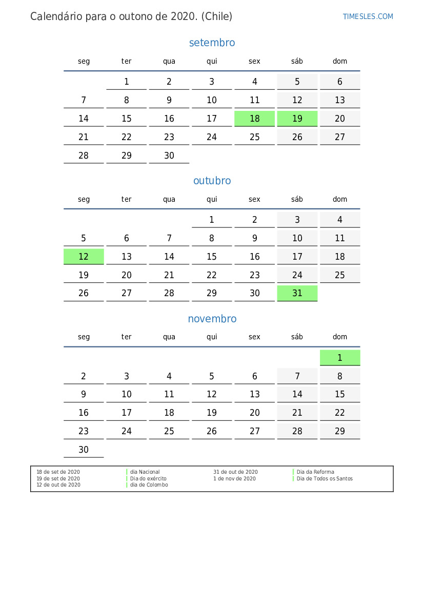 Baixe e imprima calendário em PDF com feriados e fins de semana para o outono de 2020 para o Chile
