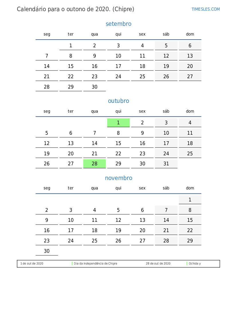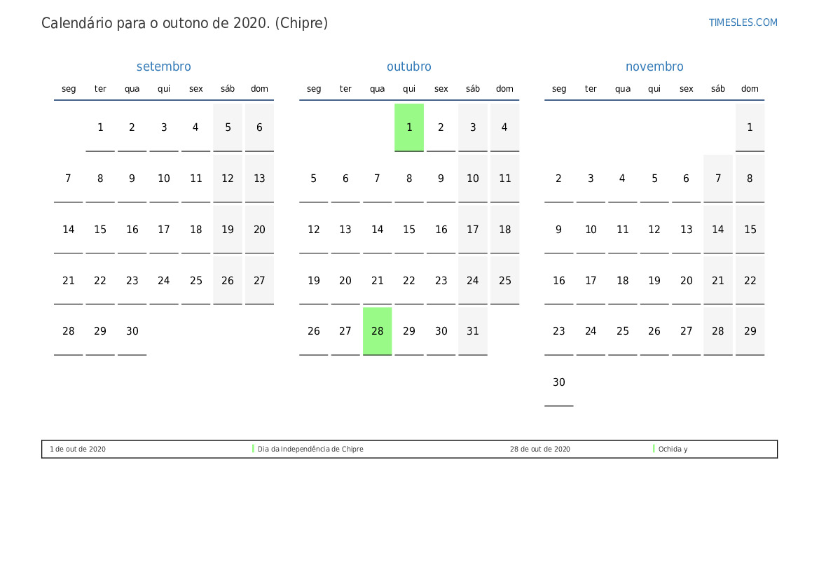 Baixe e imprima calendário em PDF com feriados e fins de semana para o outono de 2020 para Chipre