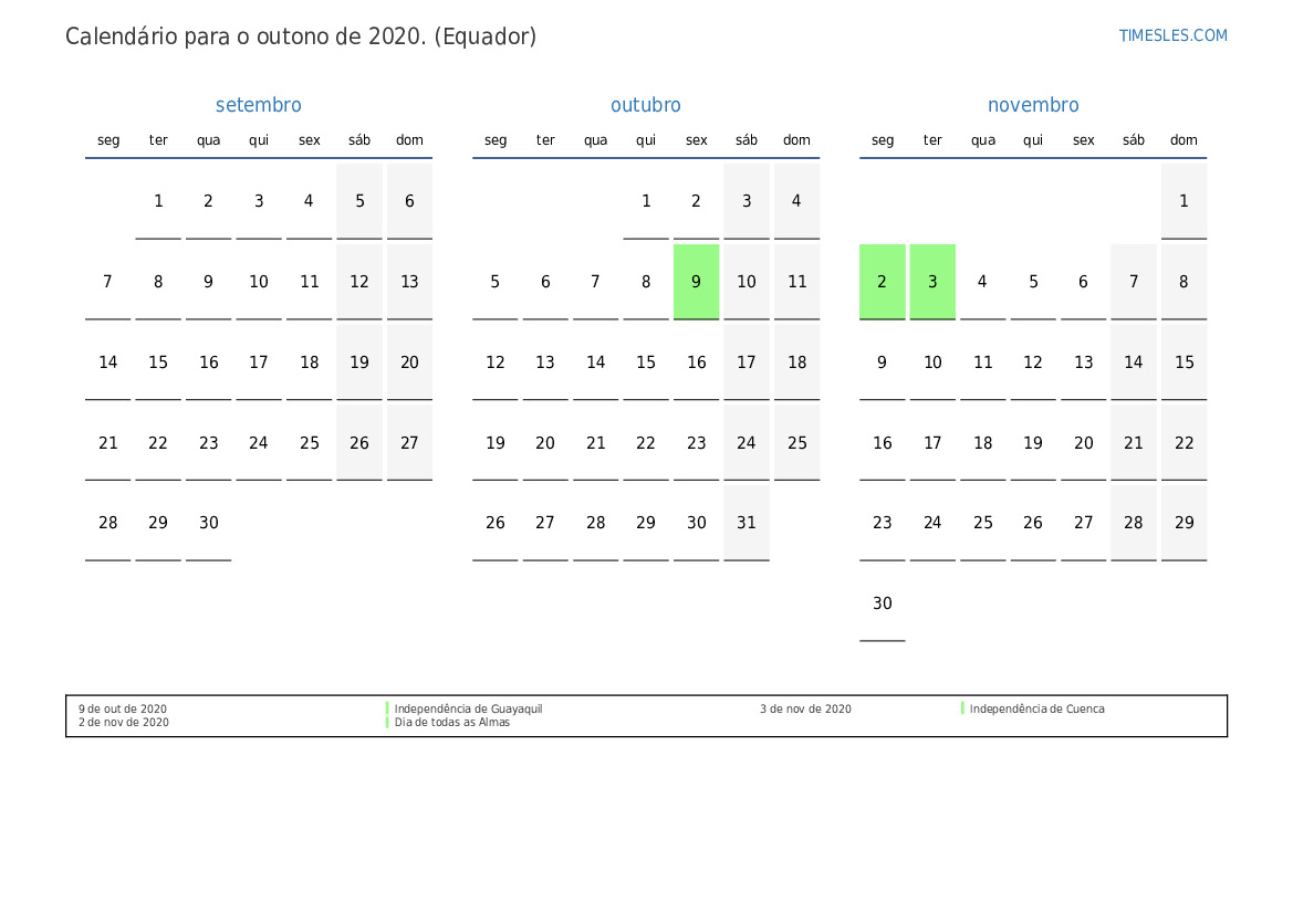 Calendário de feriados e fins de semana para o outono de 2020 para o equador