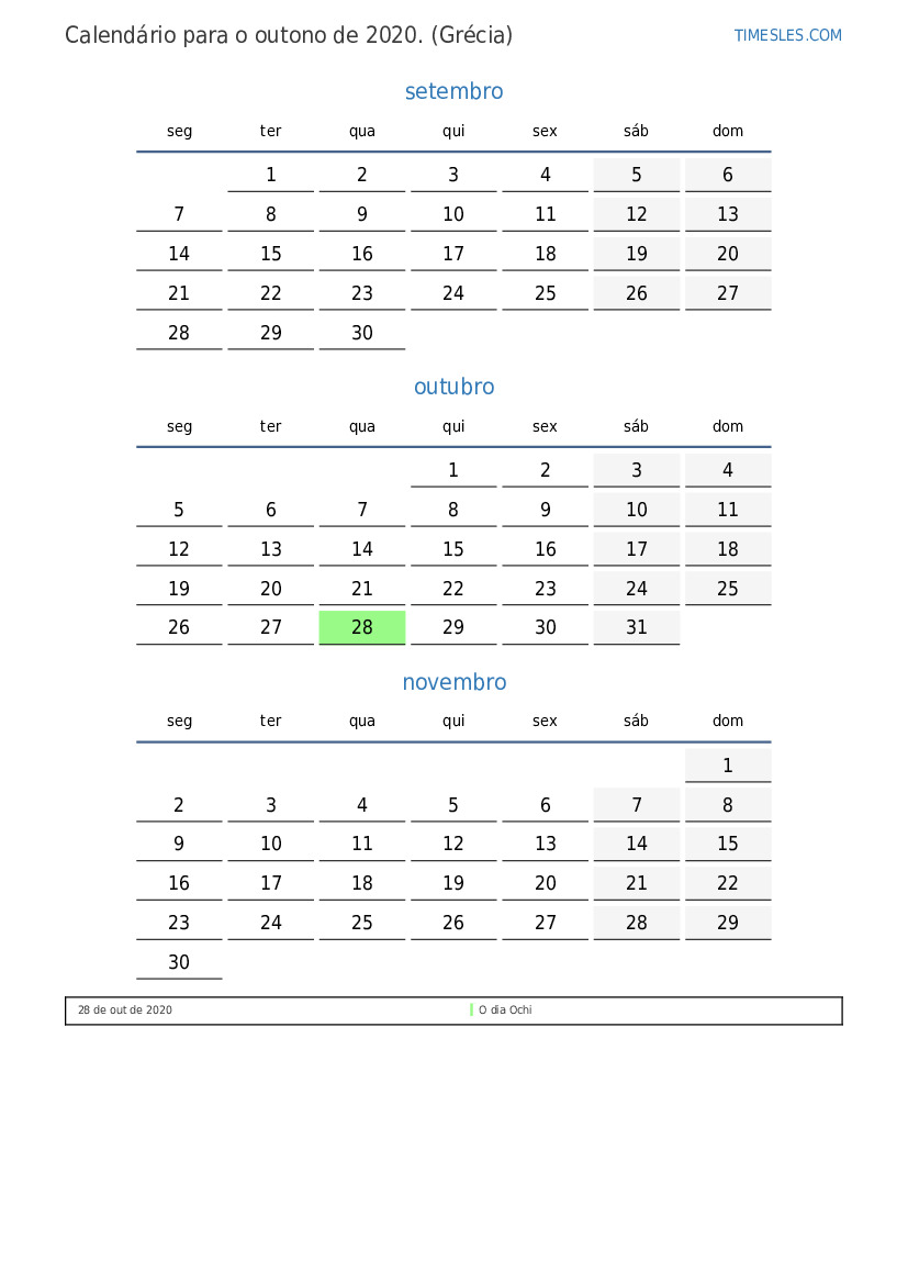 Baixe e imprima calendário em PDF com feriados e fins de semana para o outono de 2020 para a grécia