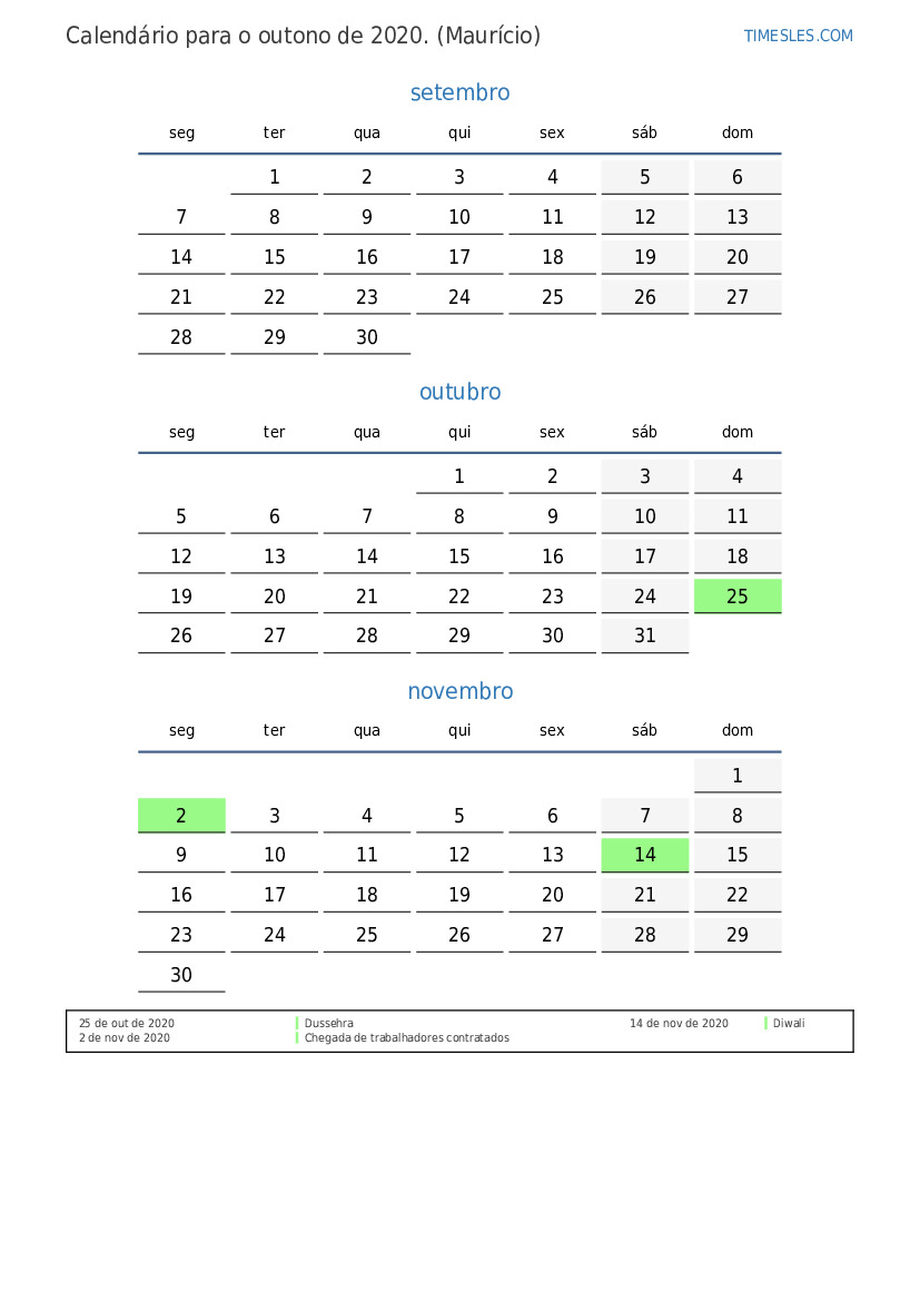 Calendário de feriados e fins de semana para o outono de 2020 para Maurício