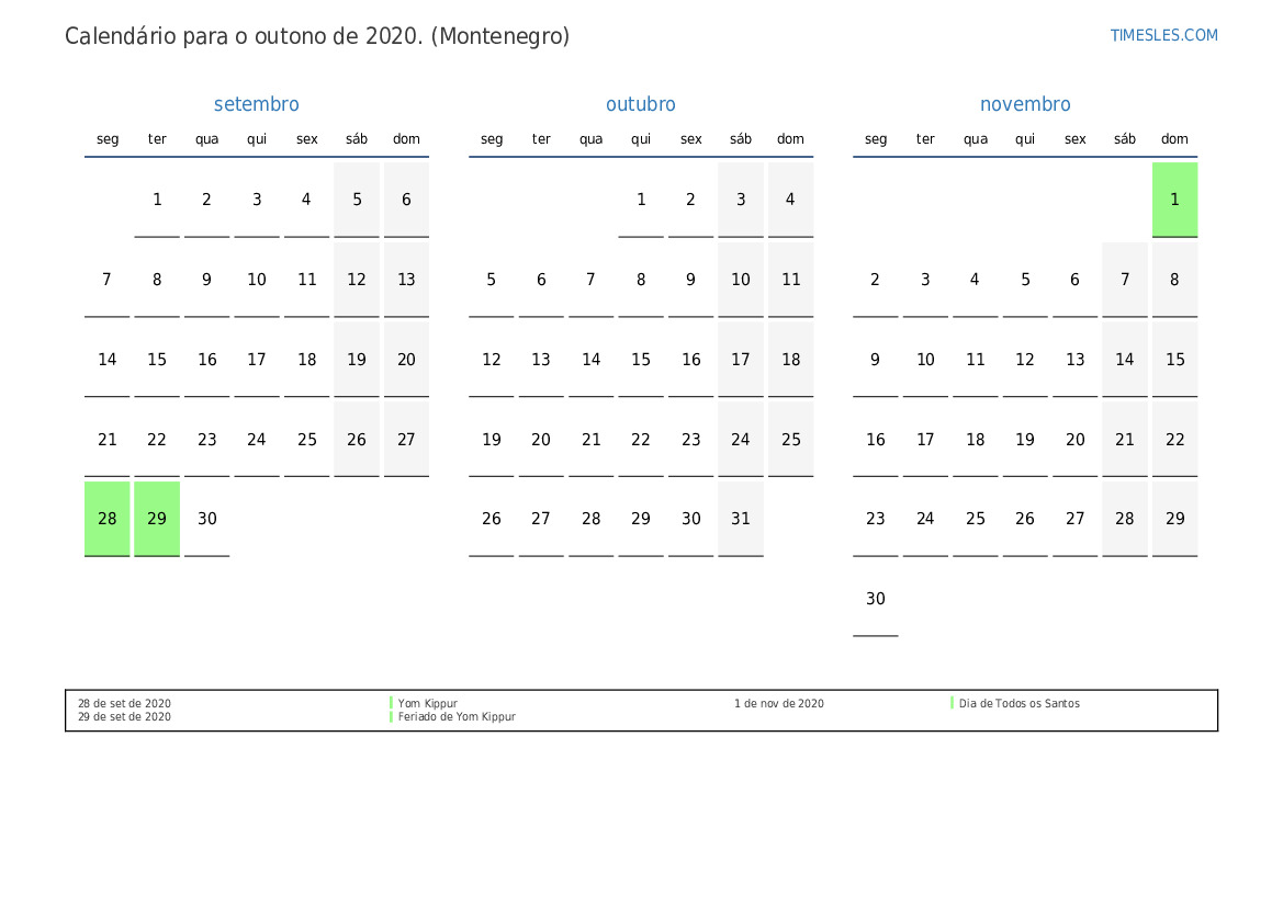 Baixe e imprima calendário em PDF com feriados e fins de semana para o outono de 2020 para Montenegro