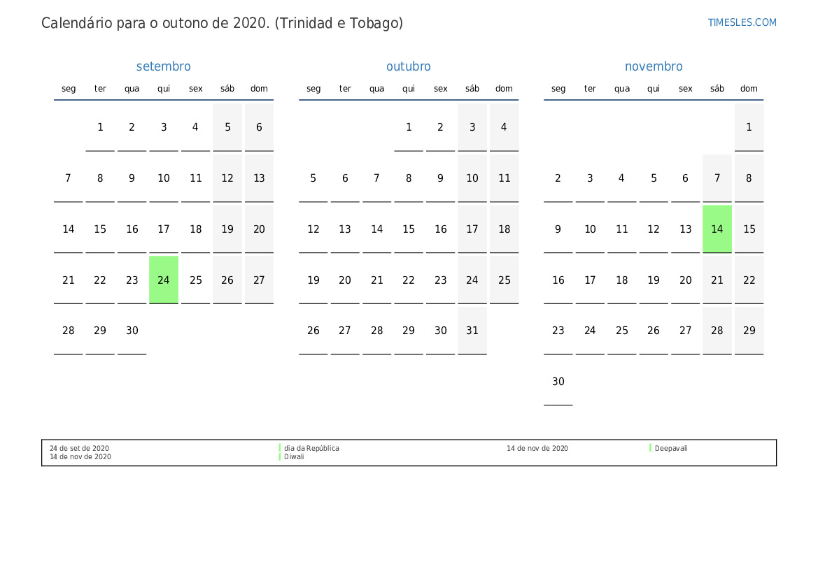 Baixe e imprima calendário em PDF com feriados e fins de semana para o outono de 2020 para Trinidad e Tobago
