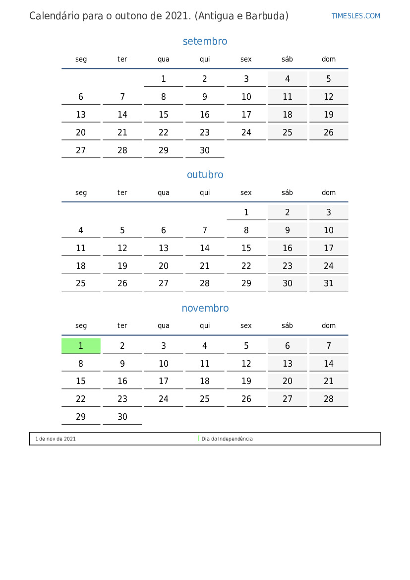 Baixe e imprima calendário em PDF com feriados e fins de semana para o outono de 2021 para Antigua e Barbuda