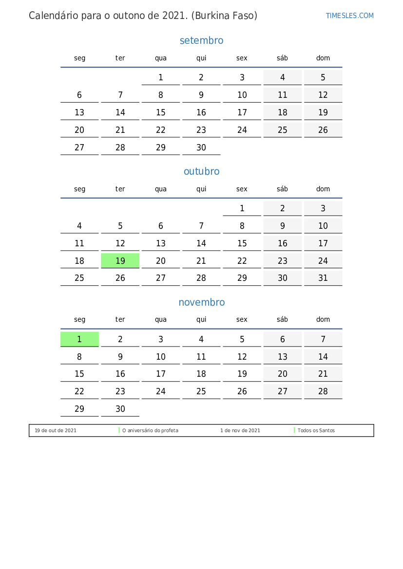 Baixe e imprima calendário em PDF com feriados e fins de semana para o outono de 2021 para Burkina Faso