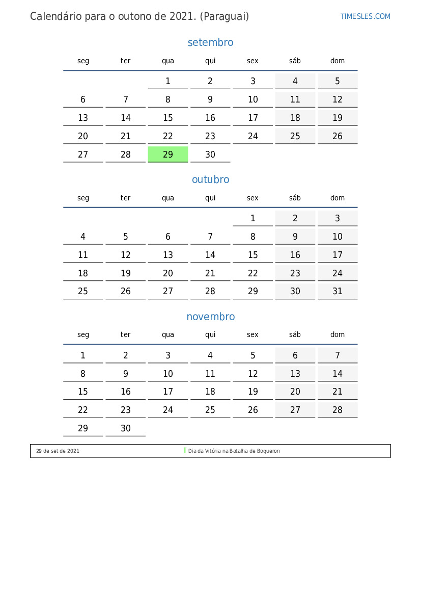 Baixe e imprima calendário em PDF com feriados e fins de semana para o outono de 2021 para o paraguai