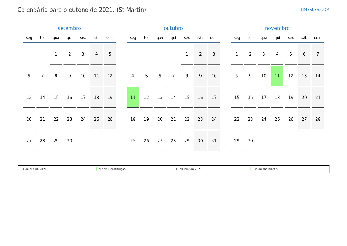 Baixe e imprima calendário em PDF com feriados e fins de semana para o outono de 2021 para Sint Maarten