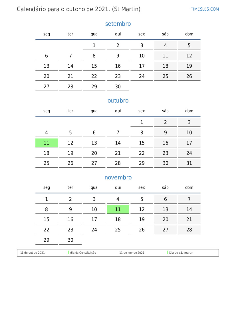 No outono de 2021, há 3 feriados e dias de folga em Sint Maarten. Outono 2021 começa na quarta-feira e termina na terça-feira.