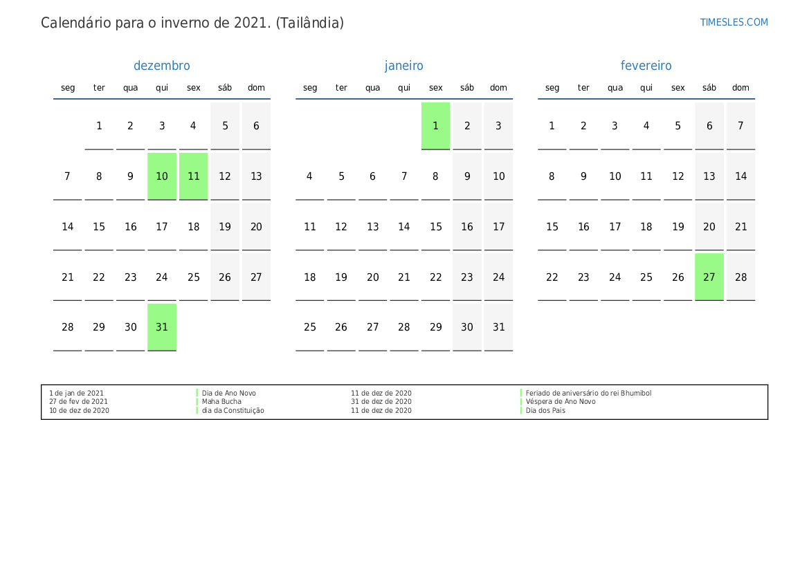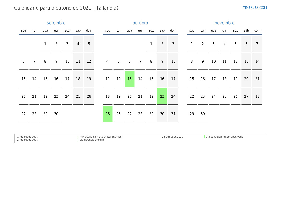 Calendário para o outono de 2021 para a Tailândia