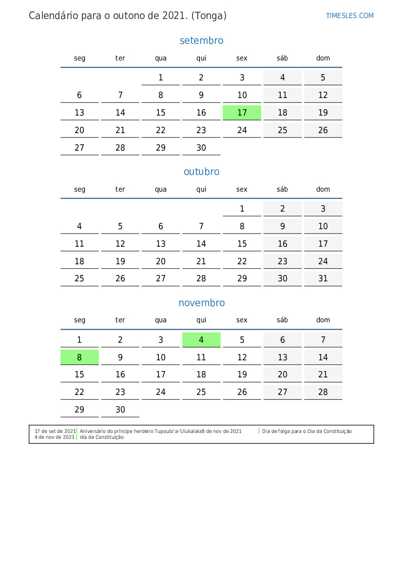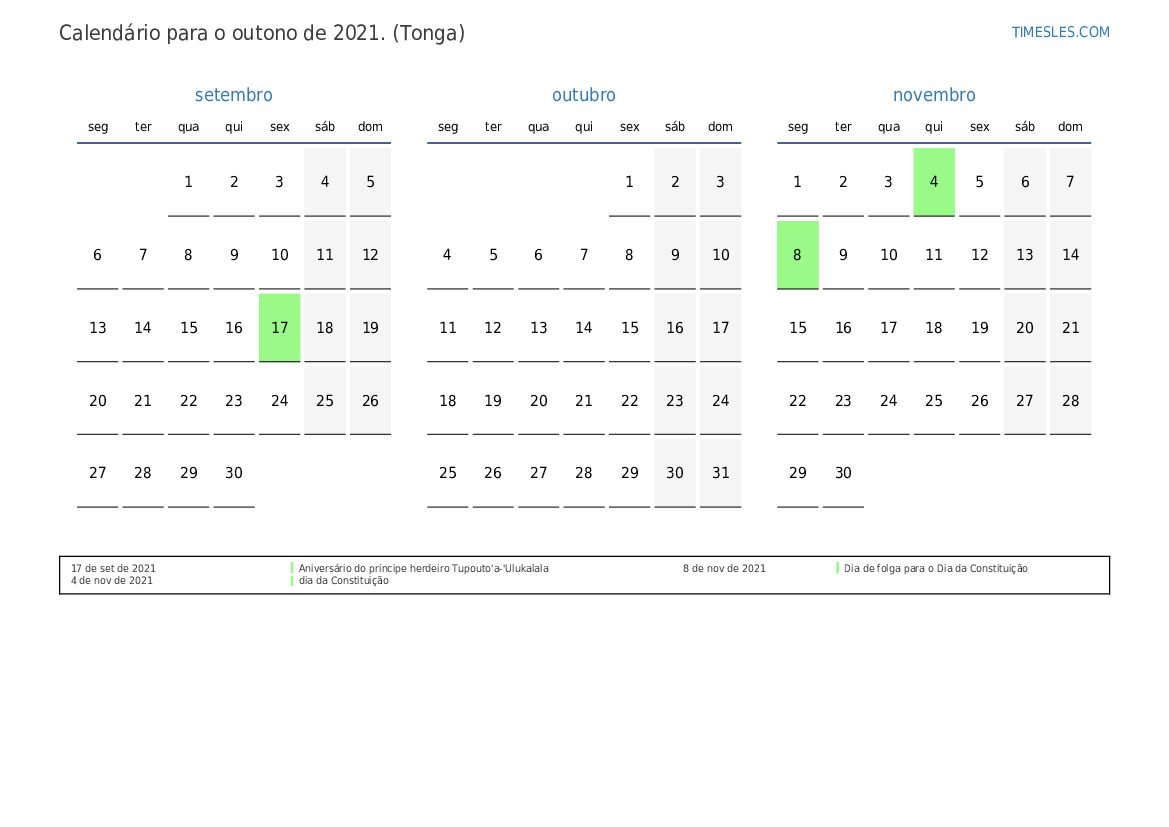 Calendário de feriados e fins de semana para o outono de 2021 para Tonga