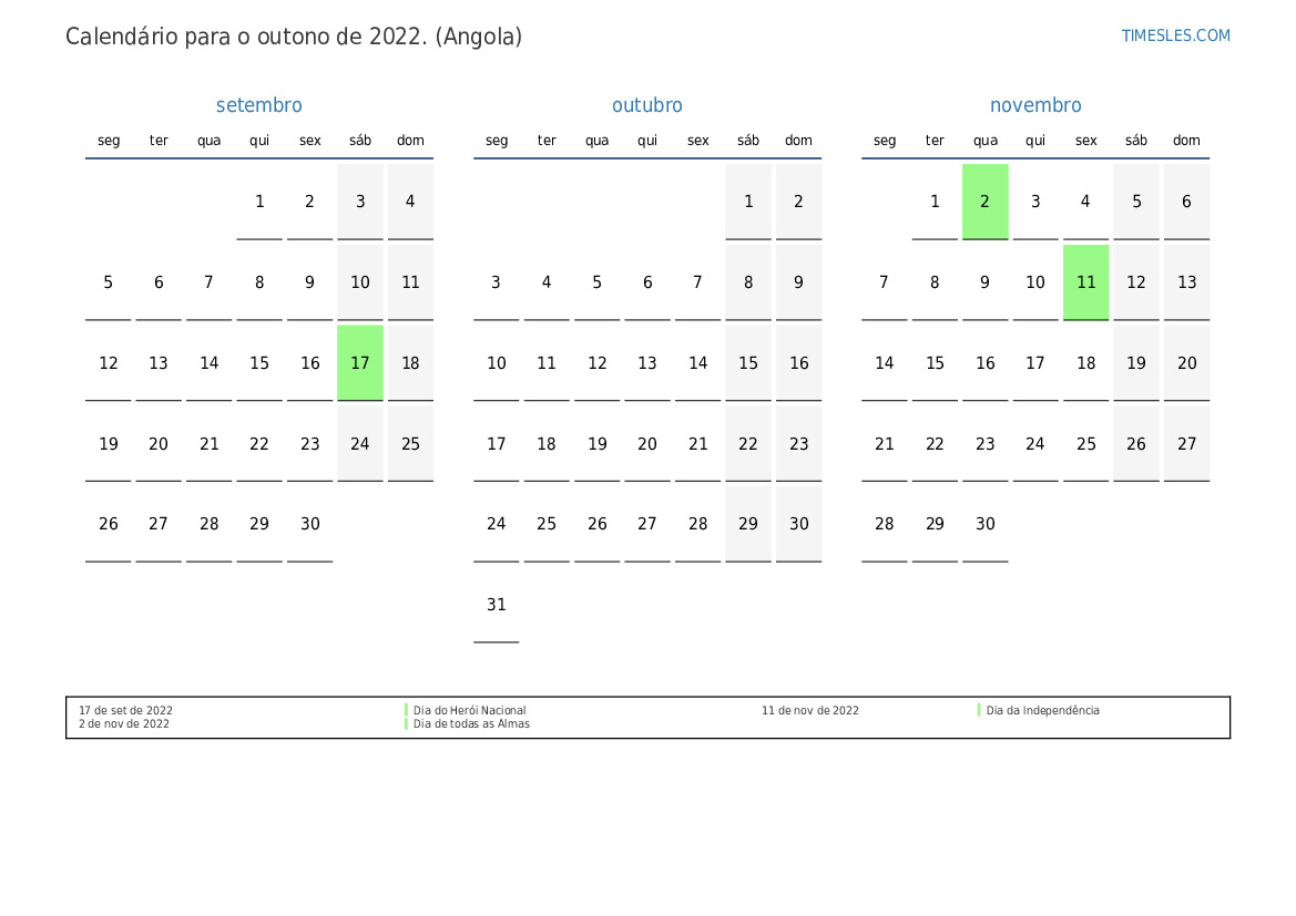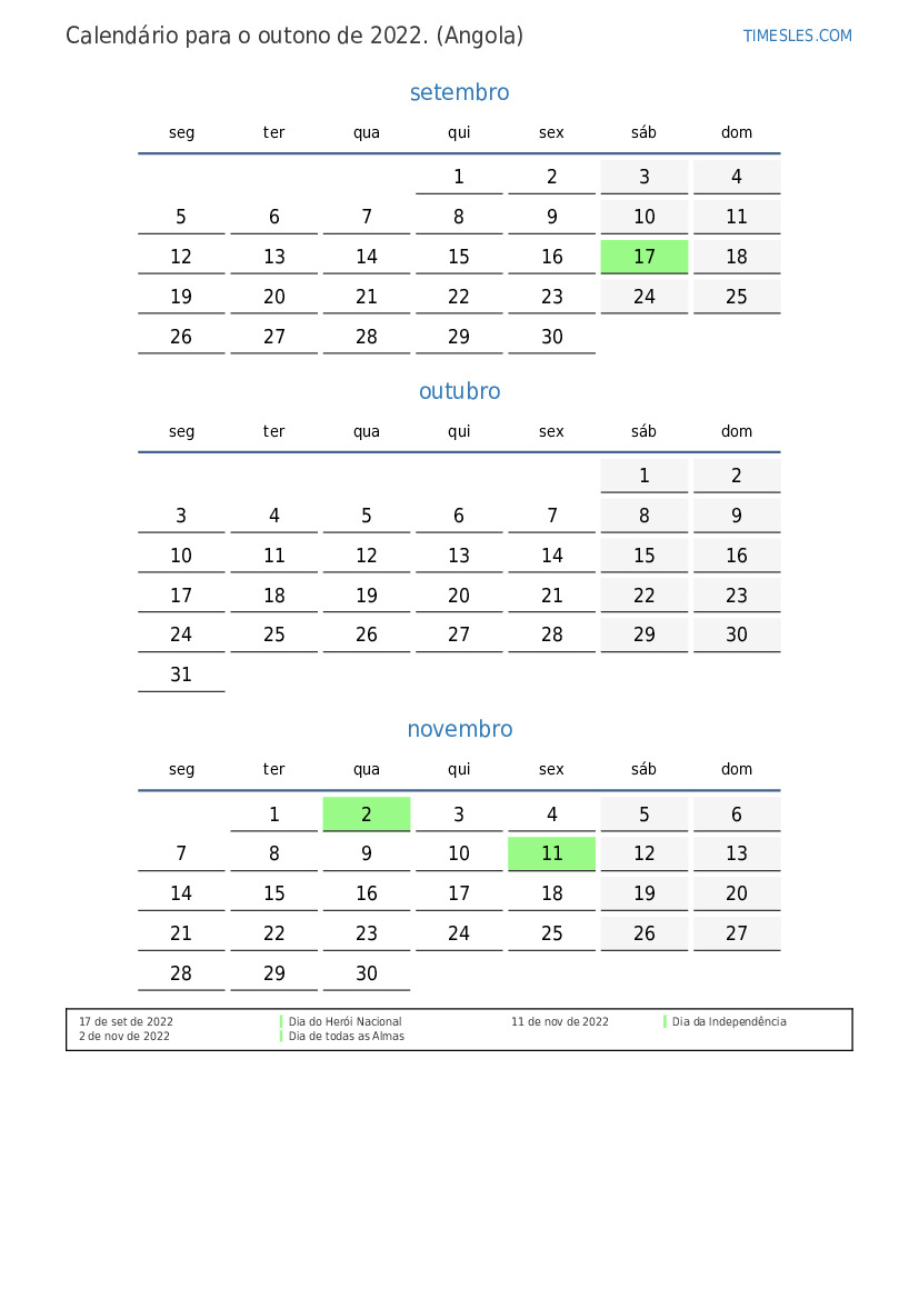 Baixe e imprima calendário em PDF com feriados e fins de semana para o outono de 2022 para angola