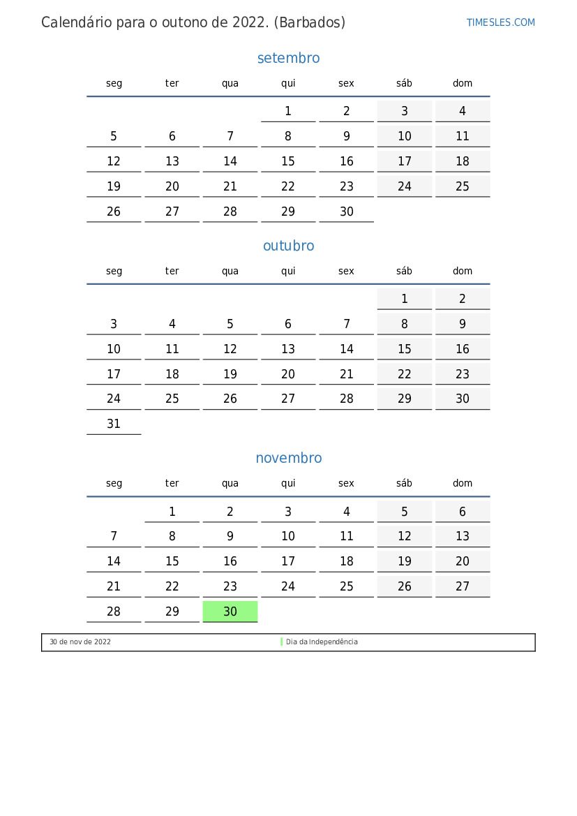 Baixe e imprima calendário em PDF com feriados e fins de semana para o outono de 2022 para Barbados