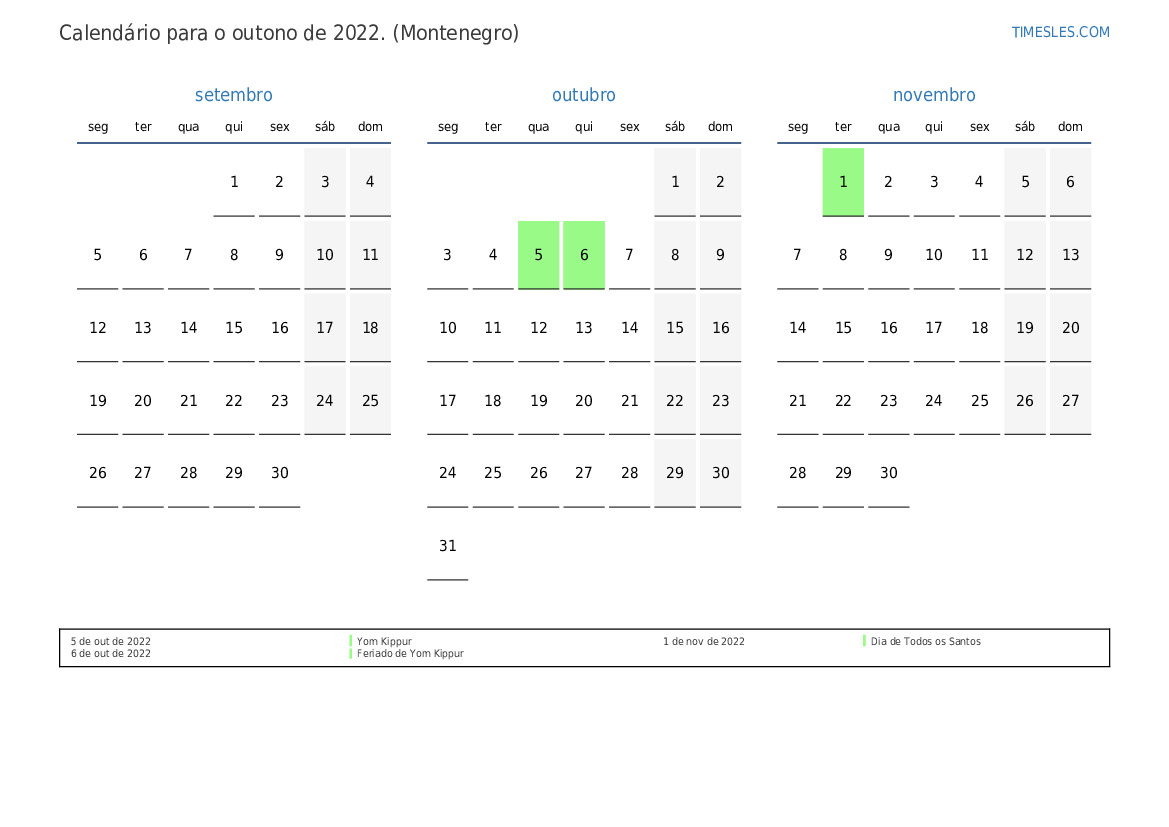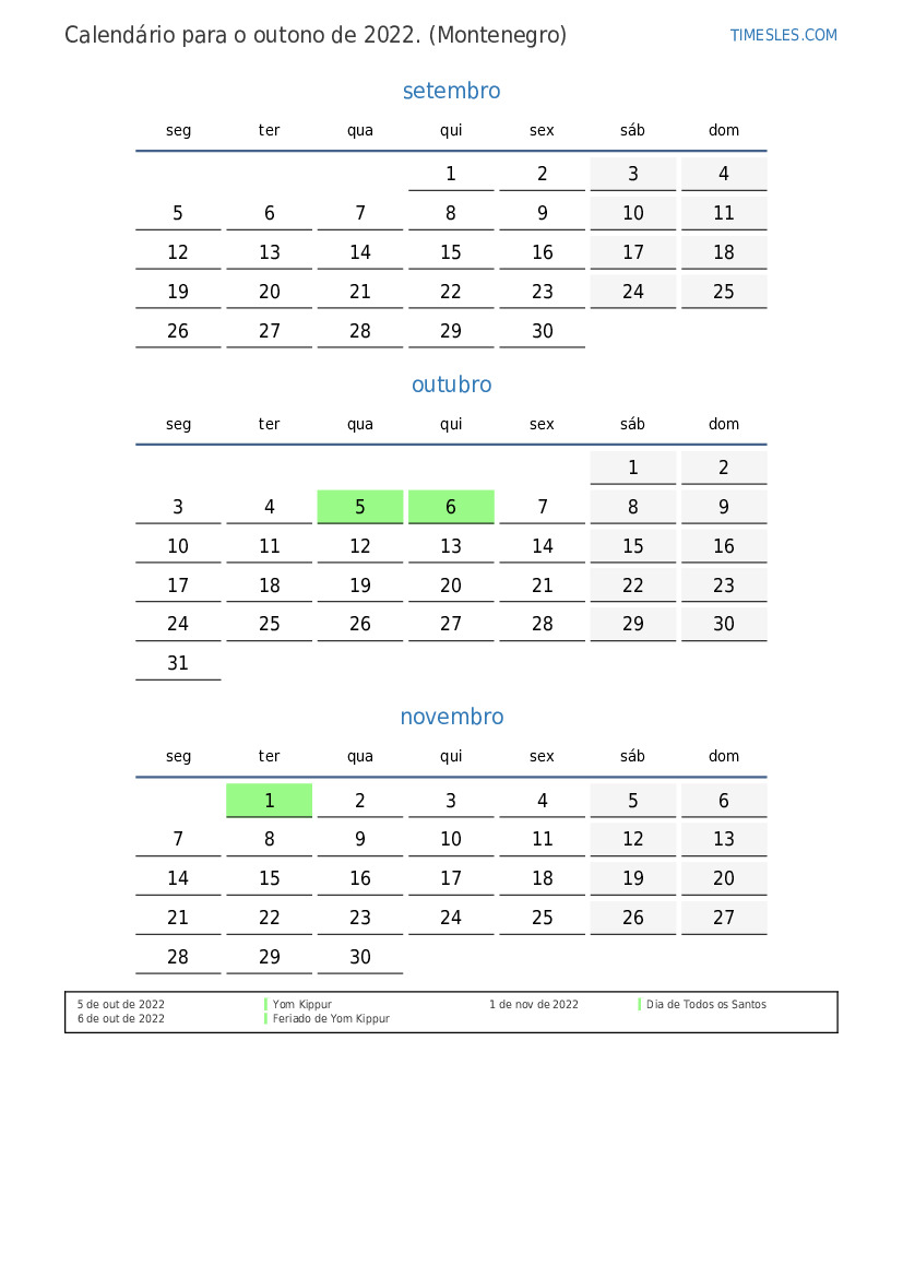 Baixe e imprima calendário em PDF com feriados e fins de semana para o outono de 2022 para Montenegro