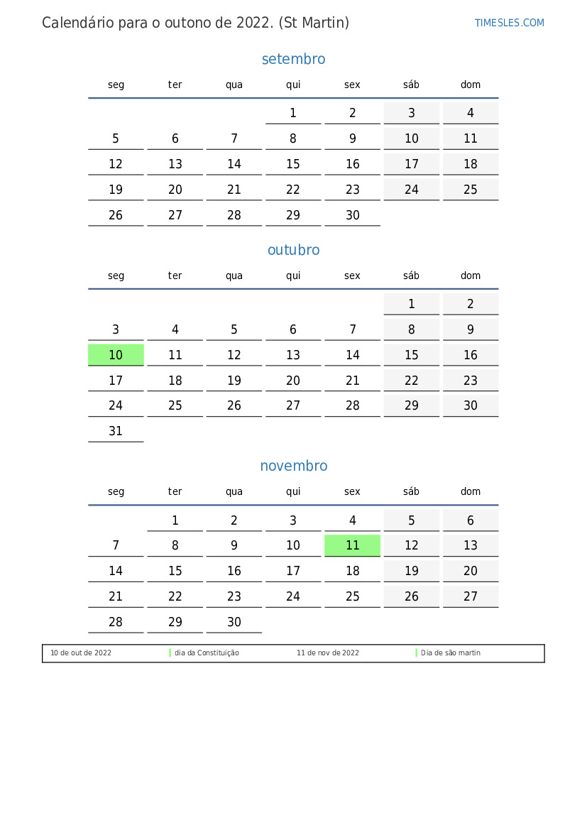 No outono de 2022, há 3 feriados e dias de folga em Sint Maarten. Outono 2021 começa na quinta feira e termina na quarta-feira.