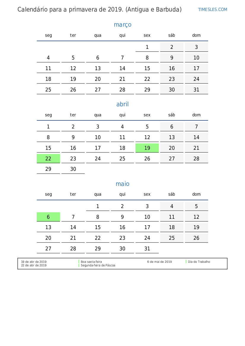 Calendário para a primavera de 2019 para Antigua e Barbuda