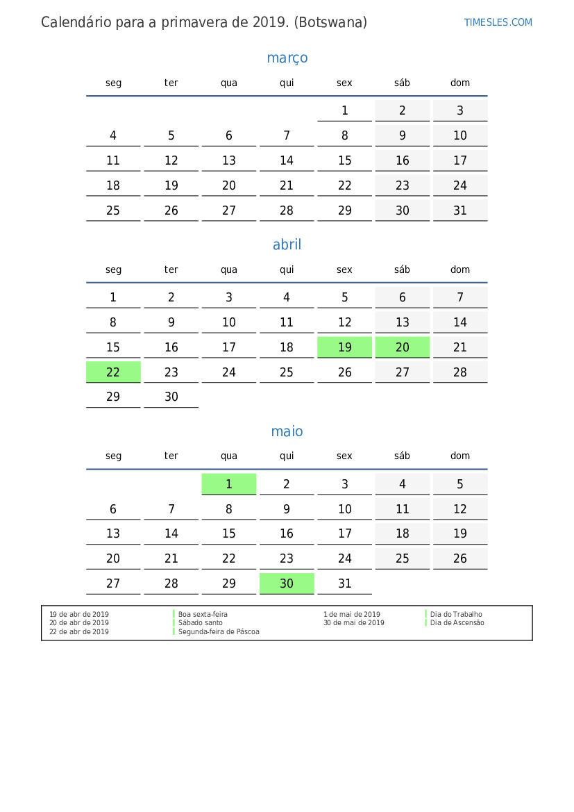 Baixe e imprima calendário em PDF com feriados e fins de semana para a primavera de 2019 para o Botswana