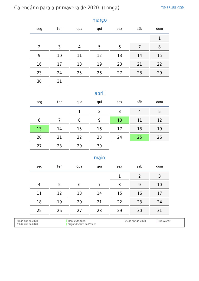 Na primavera de 2020, há 4 feriados e dias de folga em tonga. Primavera 2021 começa no domingo e termina no domingo.