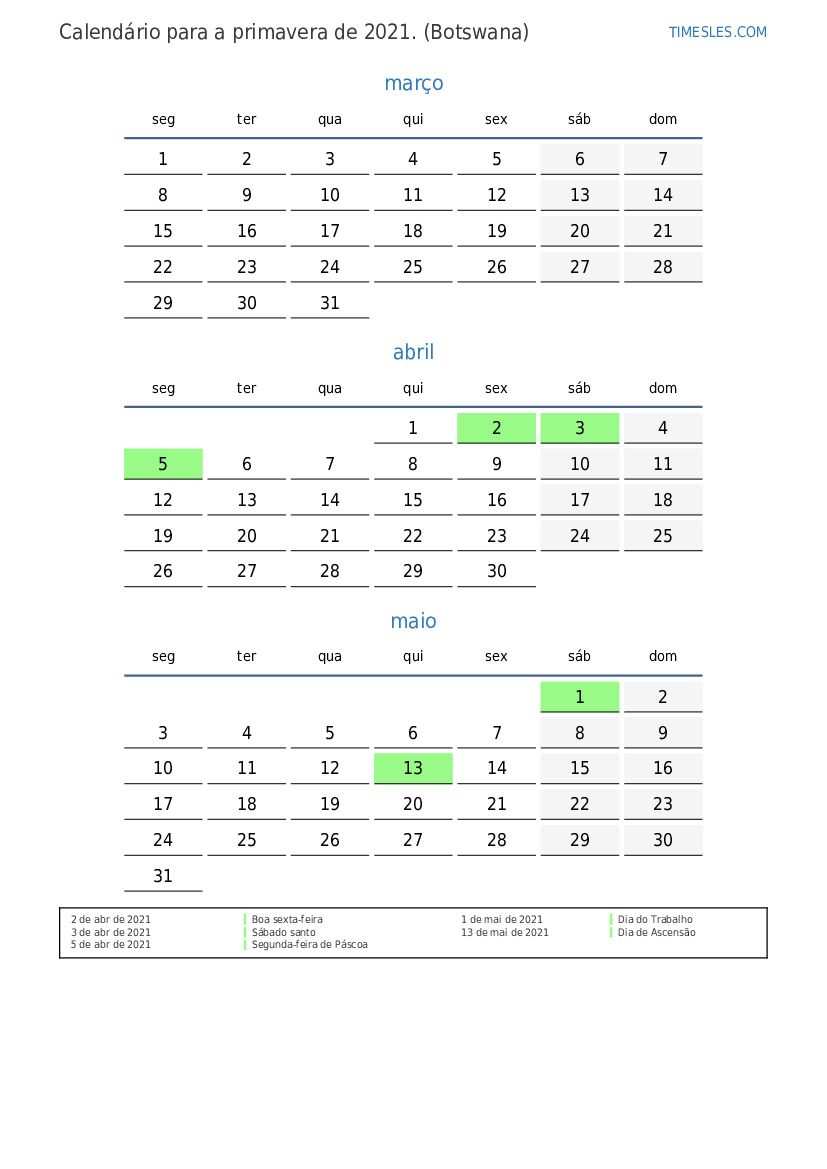 Baixe e imprima calendário em PDF com feriados e fins de semana para a primavera de 2021 para o Botswana