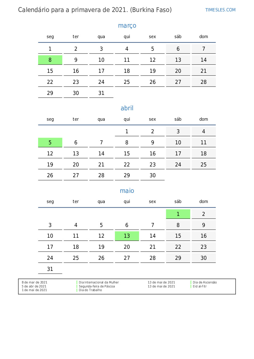 Baixe e imprima calendário em PDF com feriados e fins de semana para a primavera de 2021 para Burkina Faso
