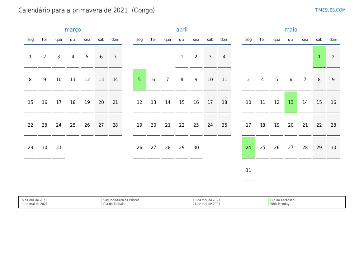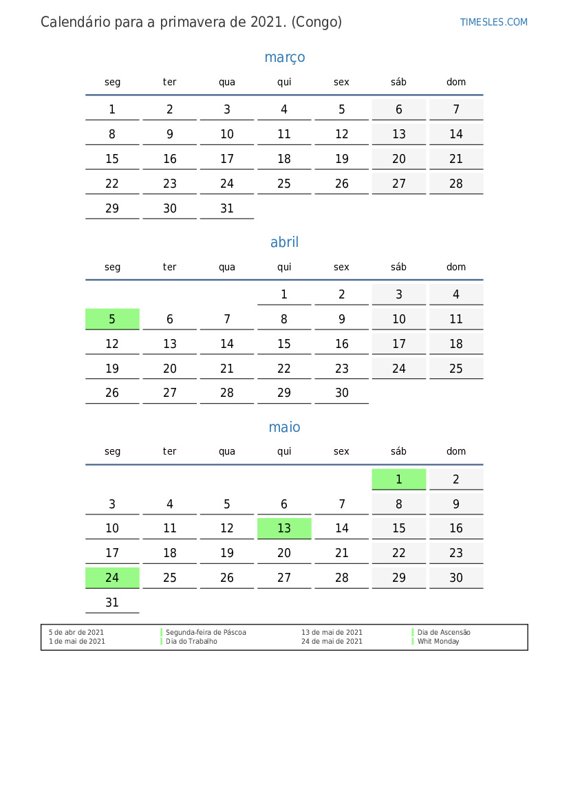 Baixe e imprima calendário em PDF com feriados e fins de semana para a primavera de 2021 para o congo