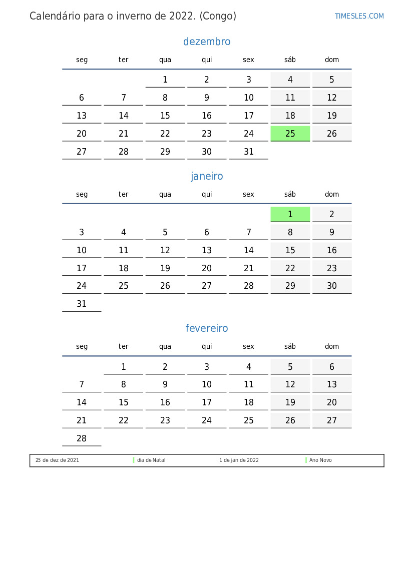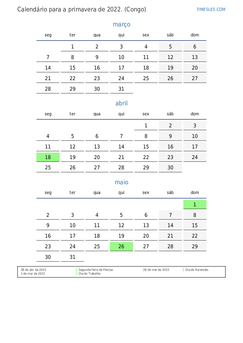Calendário de feriados e fins de semana para a primavera de 2022 para o congo
