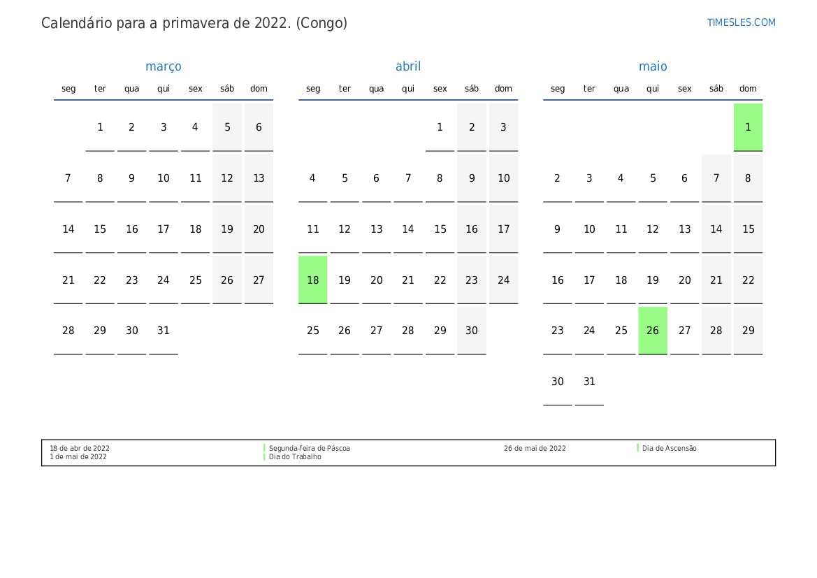 Baixe e imprima calendário em PDF com feriados e fins de semana para a primavera de 2022 para o congo