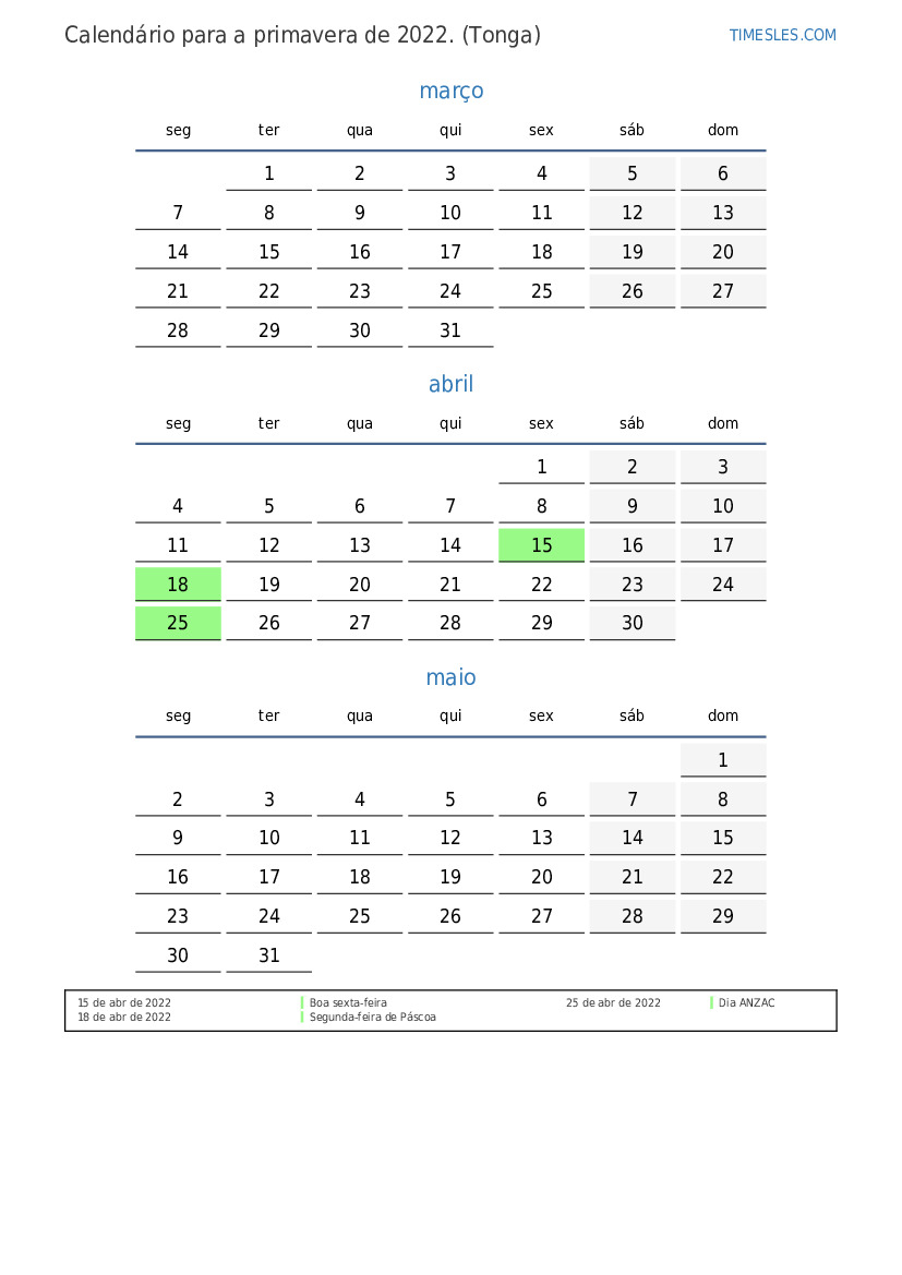 Na primavera de 2022, há 4 feriados e dias de folga em tonga. Primavera 2021 começa na terça-feira e termina na terça-feira.