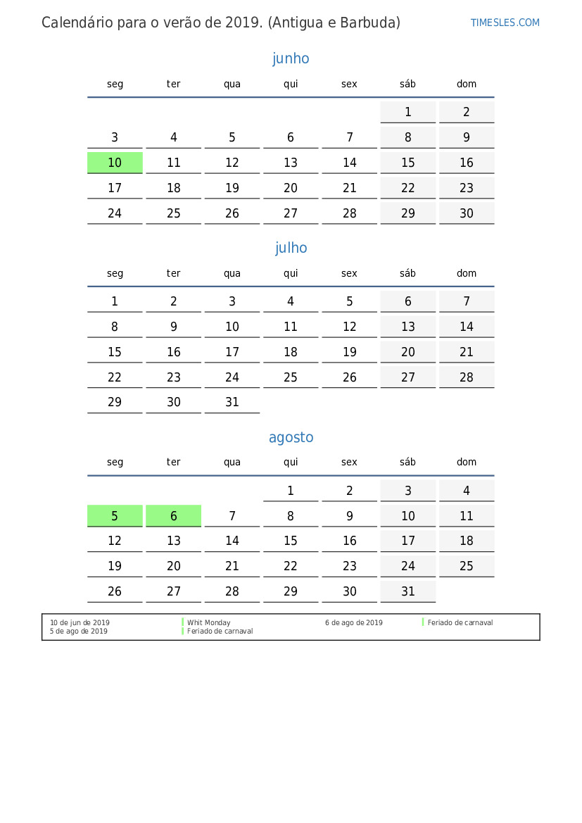Calendário para o verão de 2019 para Antigua e Barbuda