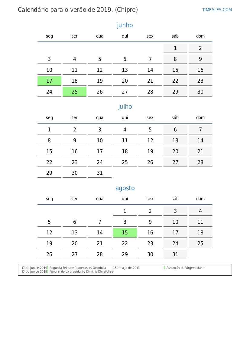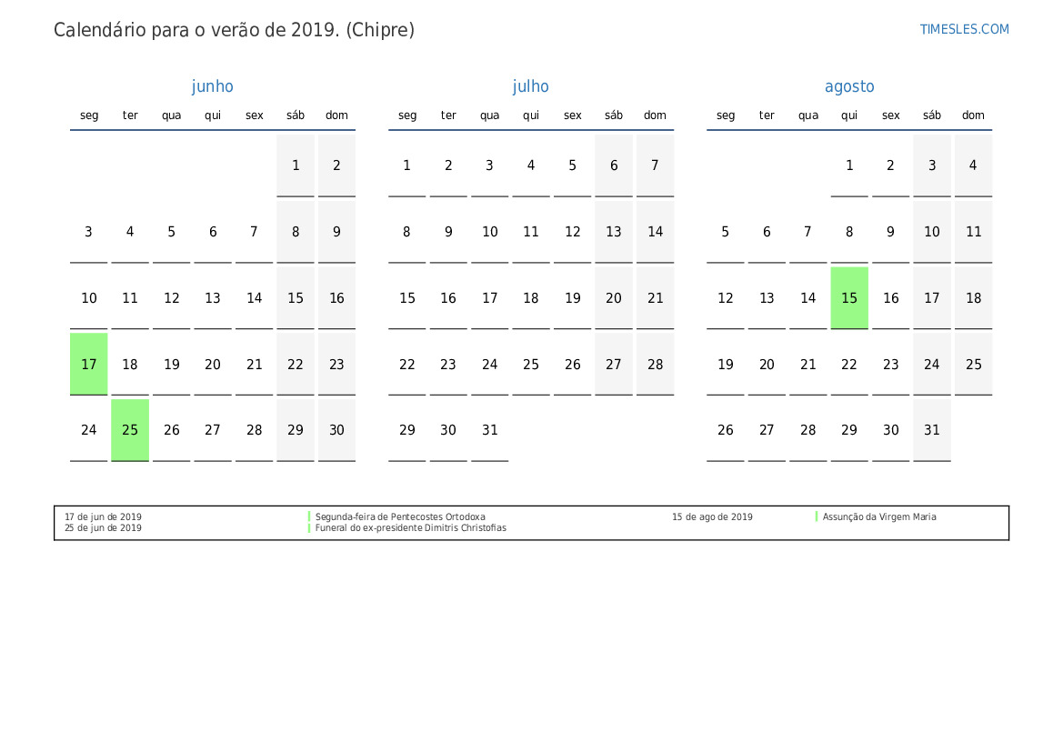 Baixe e imprima calendário em PDF com feriados e fins de semana para o verão de 2019 para Chipre