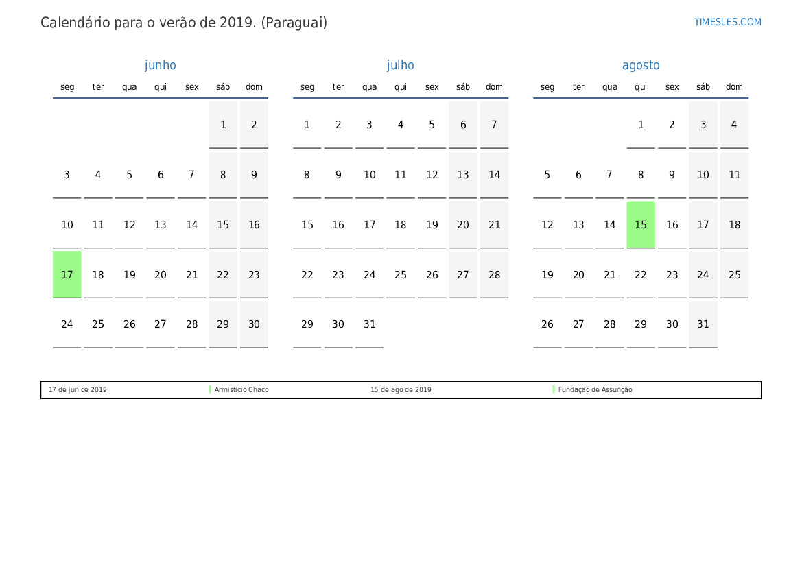 No verão de 2019, há 3 feriados e dias de folga no paraguai. Verão 2021 começa no sábado e termina no sábado.