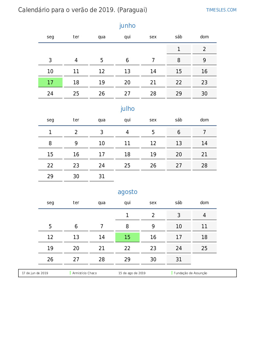 Calendário de feriados e fins de semana para o verão de 2019 para o paraguai