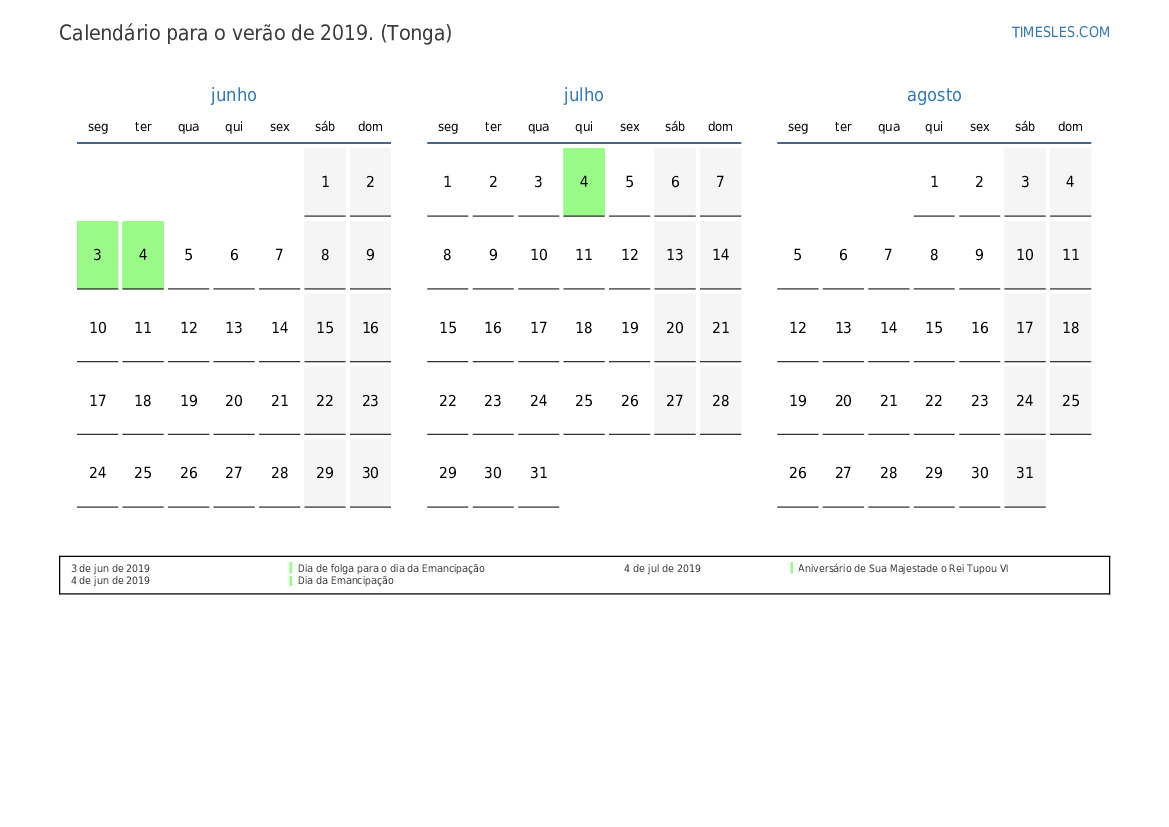 Calendário de feriados e fins de semana para o verão de 2019 para Tonga