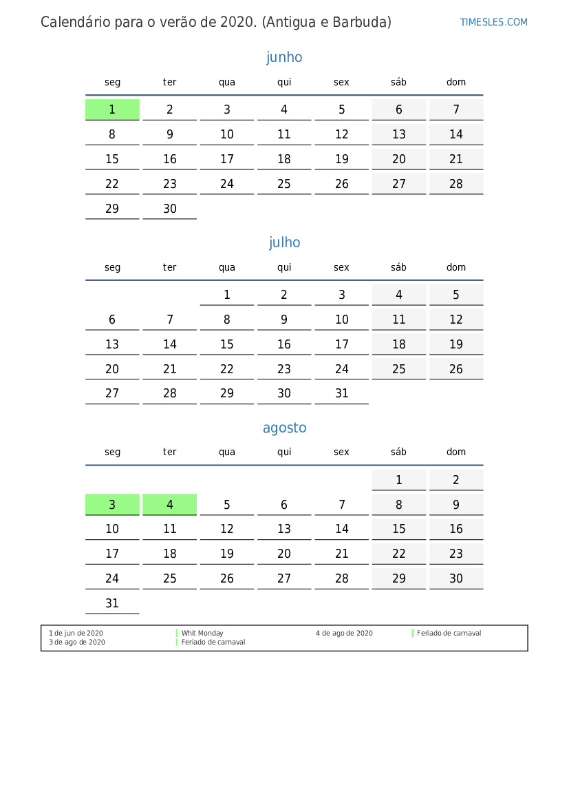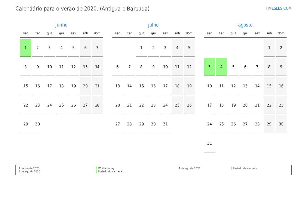 Calendário para o verão de 2020 para Antigua e Barbuda
