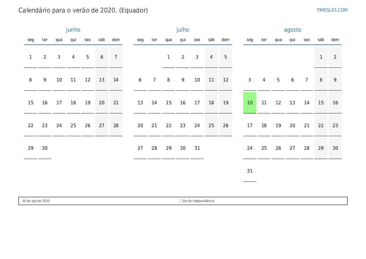 Calendário de feriados e fins de semana para o verão de 2020 para o equador