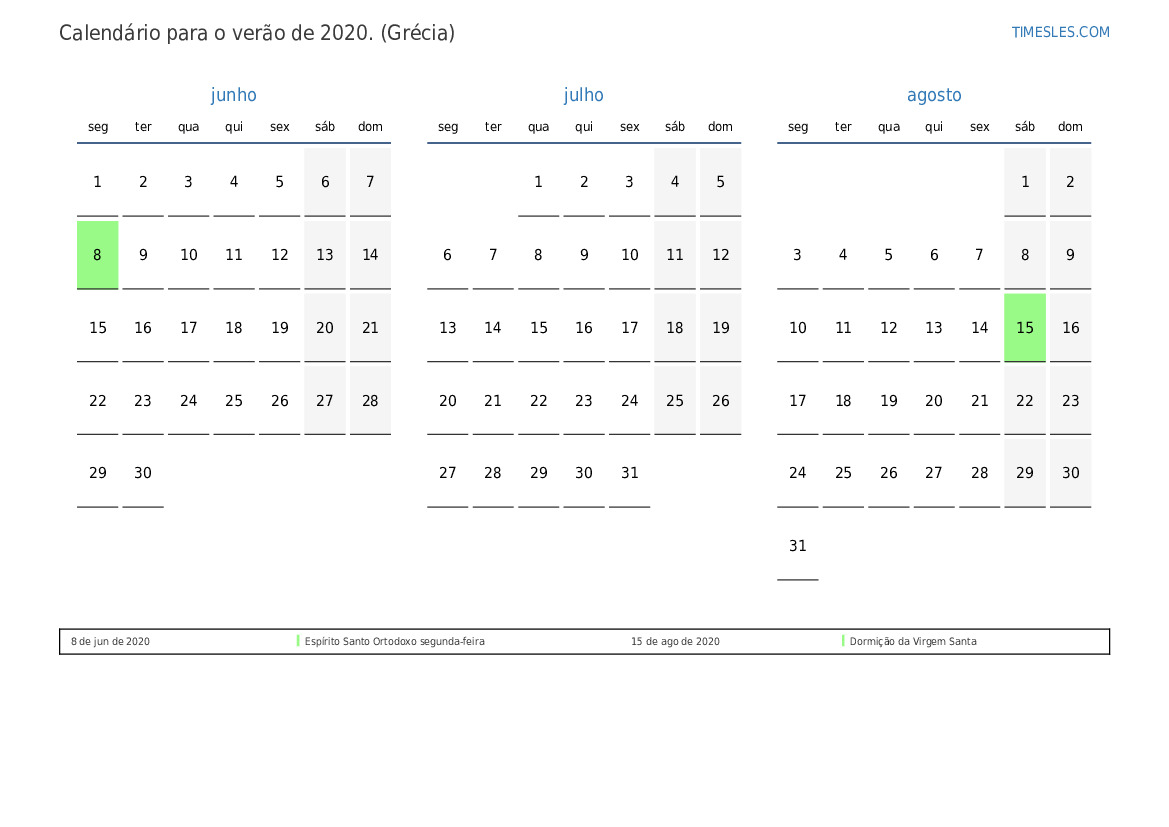 Baixe e imprima calendário em PDF com feriados e fins de semana para o verão de 2020 para a grécia