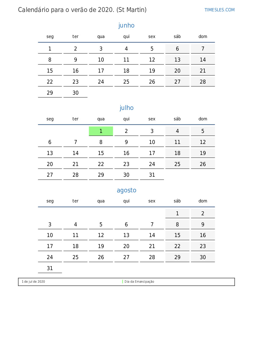 Baixe e imprima calendário em PDF com feriados e fins de semana para o verão de 2020 para Sint Maarten